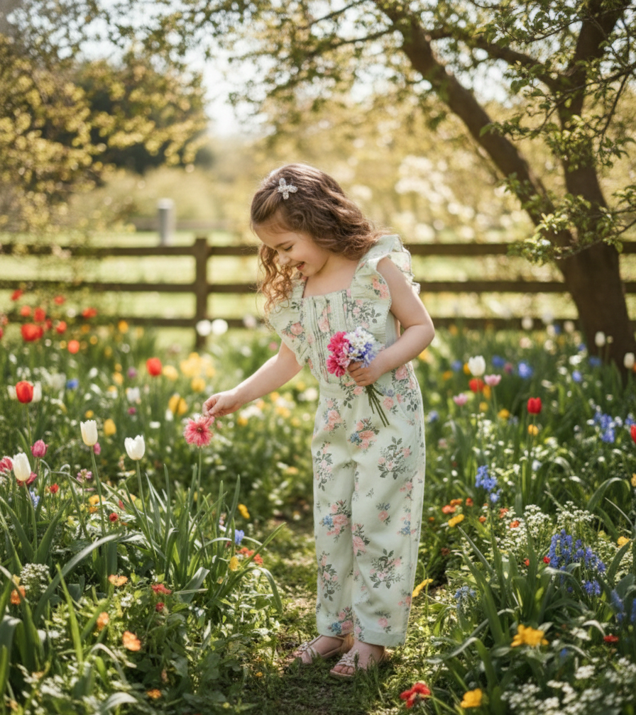 A little elegance, a little whimsy, and a whole lot of charm — The Garden Gala Organic Cotton Floral Jumpsuit is designed for the sweetest spring moments. Crafted from smooth organic cotton sateen, this wide-leg silhouette feels lightweight, soft, and effortlessly refined. Flouncy flutter sleeves frame the look with a delicate touch, while pintuck details, a button-front design, and crochet trim add beautiful dimension. Side pockets and an elastic back waist ensure comfort meets practicality, making it easy for your little one to move, twirl, and explore in style. A truly stunning piece, perfect for everything from garden parties to picture-perfect celebrations.